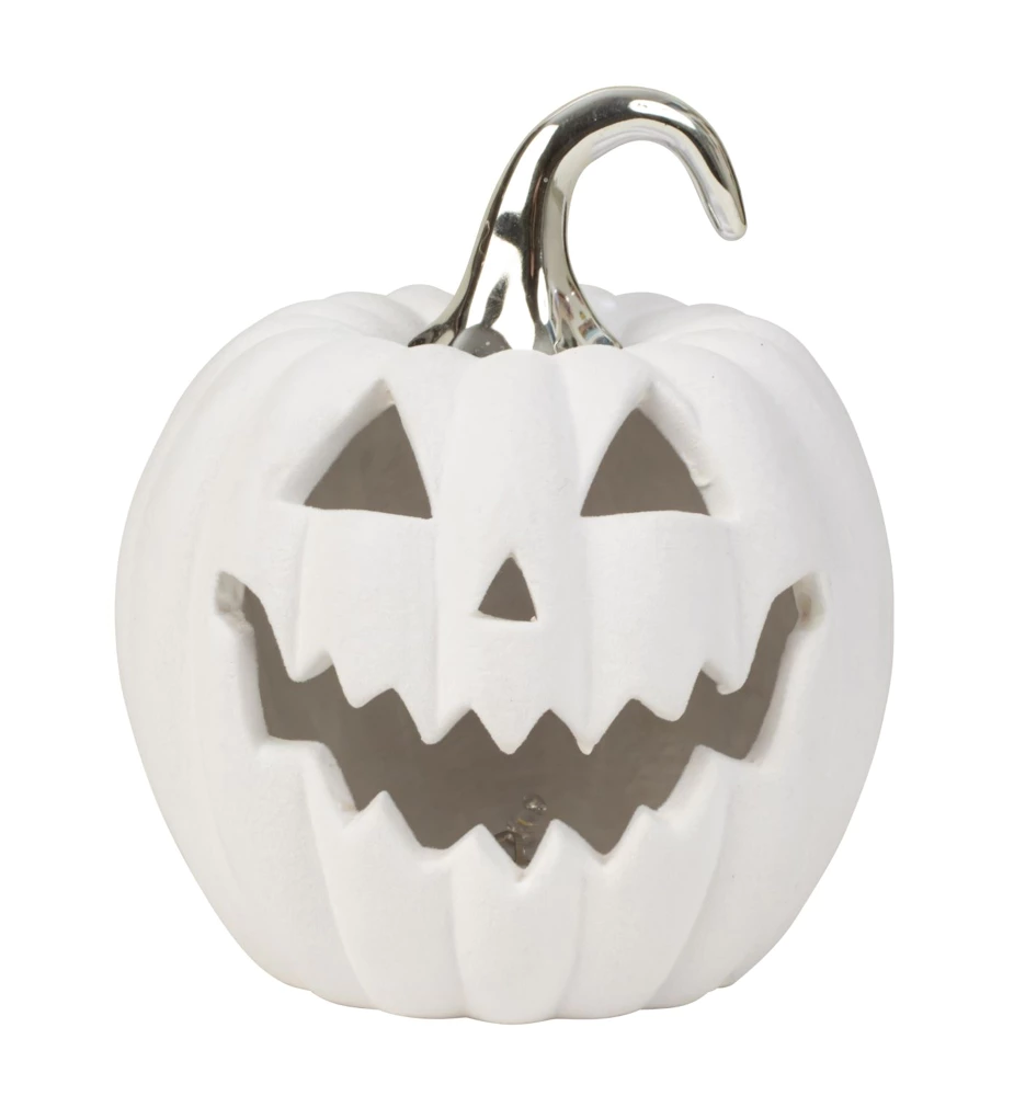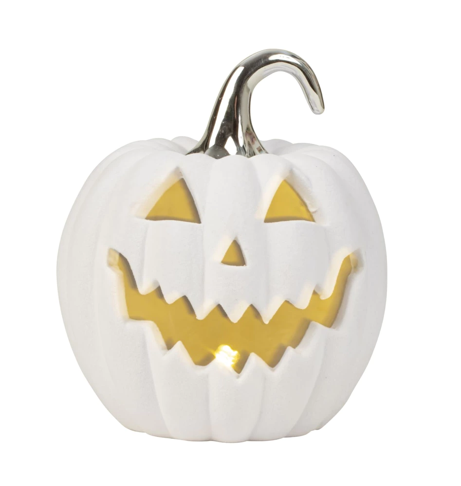 Halloweenpumpa med vitt sammetsöverdrag och LED-ljus